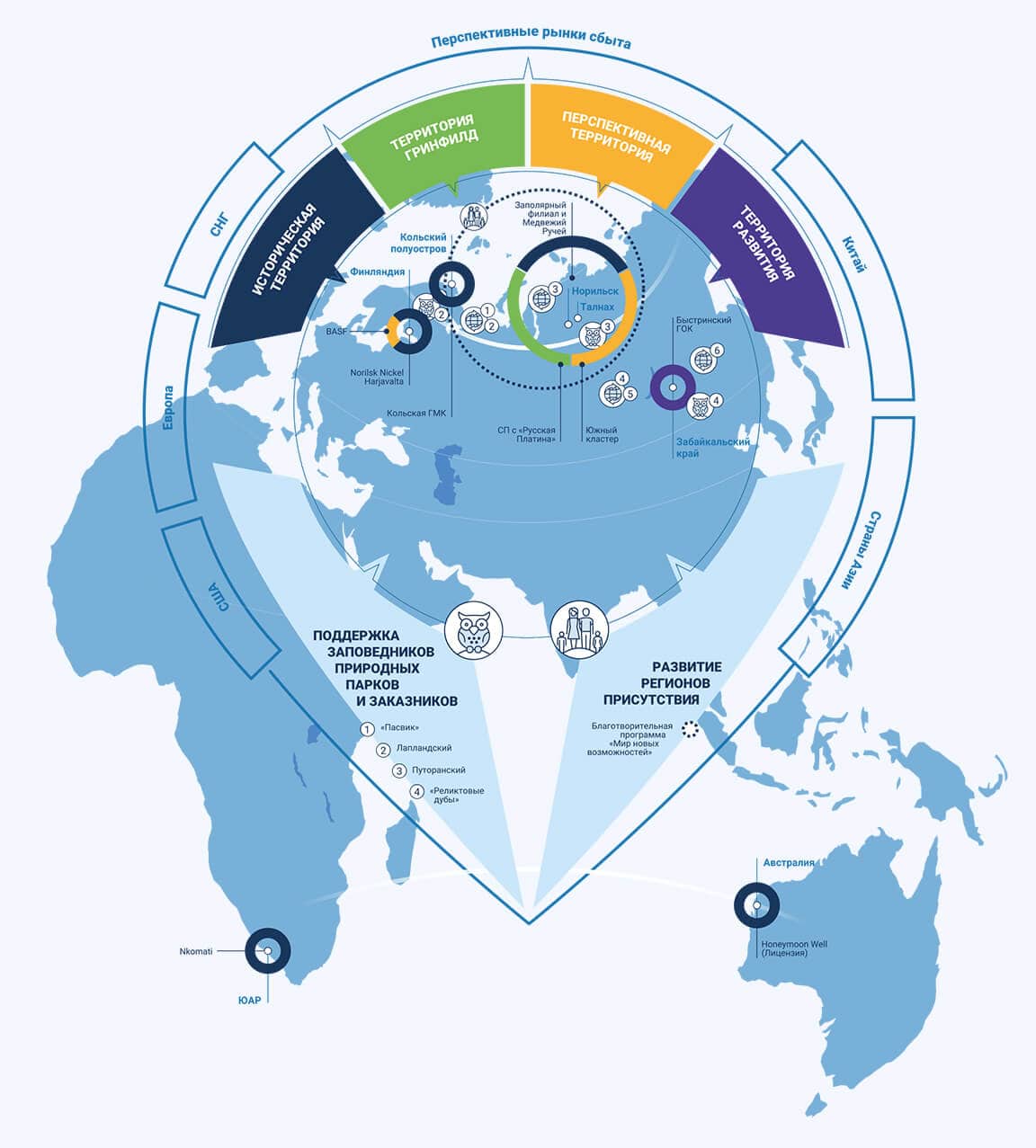 Заполярный филиал Компании находится в 80–100 км от буферной зоны заповедника «Путоранский» Красноярского края, а предприятия Кольской ГМК — примерно в 15 км от заповедника «Пасвик» и в 10 км от Лапландского заповедника Мурманской области.